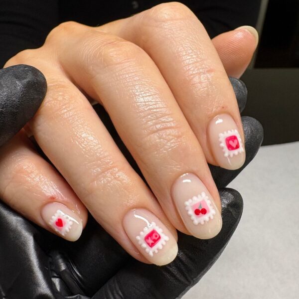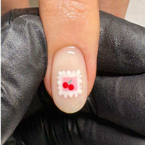 Using the Neat + Tidy Dotting Tool and Statement Gel in Indulgent Heart, add two dots to each middle finger stamp. Cure, then connect the dots using Statement Gel in Positively Playful and a thin nail brush to create cherries. Cure.