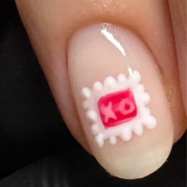 Using a thin nail art brush and Statement Gel in Fondant Fancy, write a personalised message on the ring finger stamps - for example, the first initial of a loved one's name or XO, as shown here. Cure.