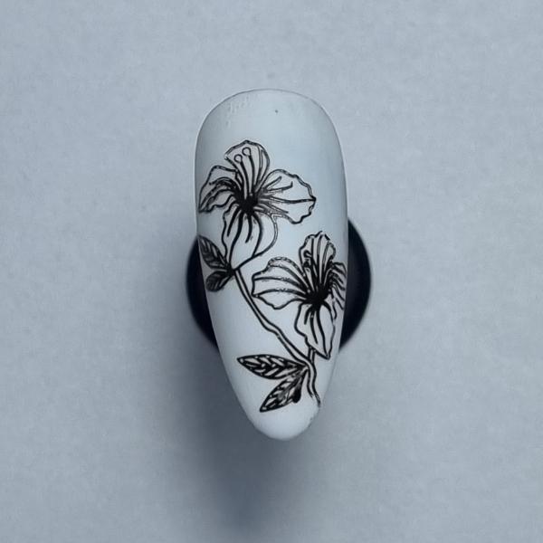 Apply your stamping polish next to preferred image then swipe the polish over the image with scraper. Roll over the image with your stamper and place your stamped image onto the nail