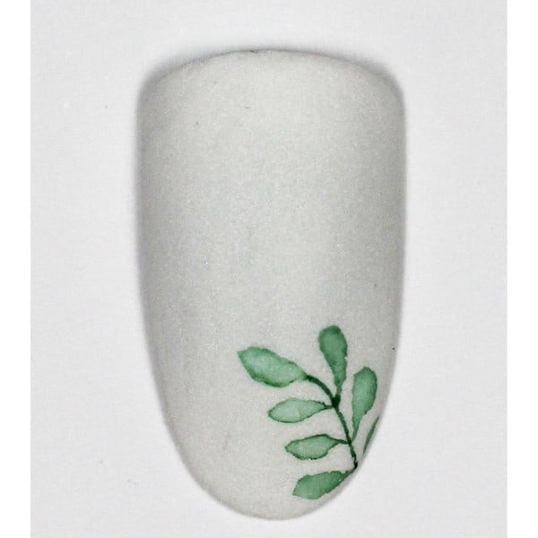 Prepare the nail, build structure with LART Supreme Natural Powder. Add two coats of white with LART Gel Supreme and LS 01 colour powder. Carefully file and buff the nails. Then apply LART Supreme Shine Formula on the nails using a clean, lint-free pad, wipe the entire nail with the moistened pad. Start painting the first foliage stem with green watercolour. Paint leaves and use your brush to remove excess water and to create the signature watercolour effect.