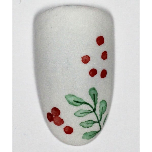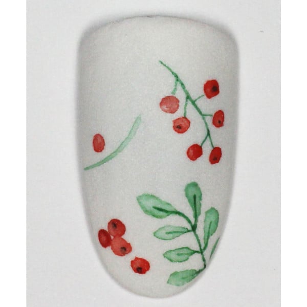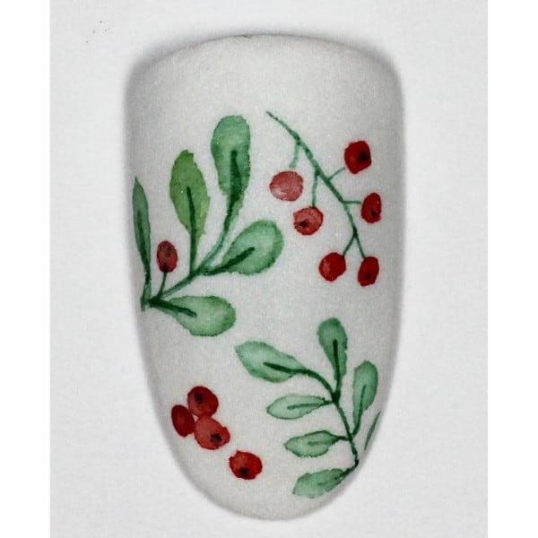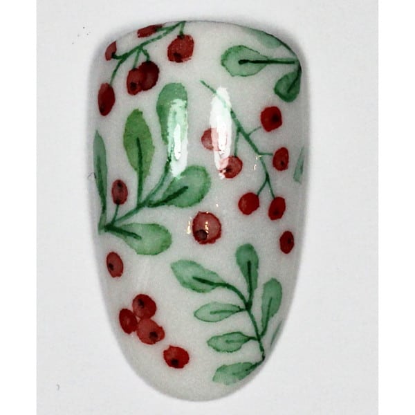Keep adding leaves with green watercolour. Continue adding leaves, clusters and single berries until the nail is covered without big gaps.