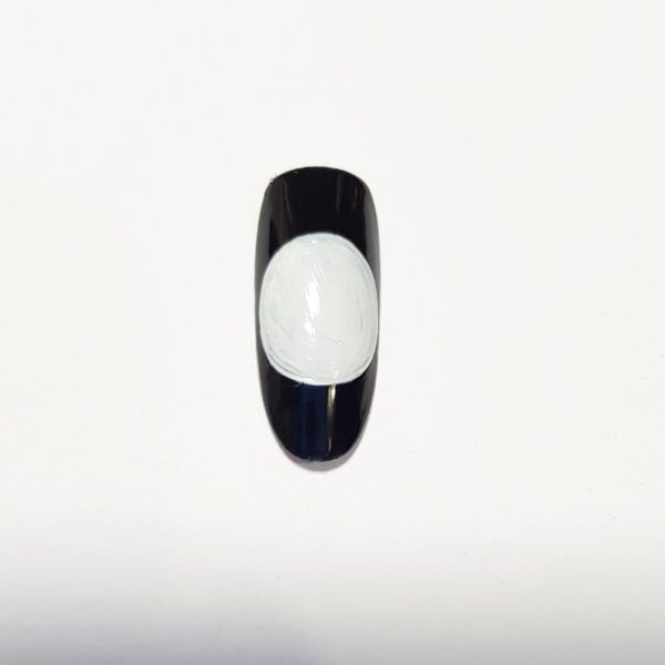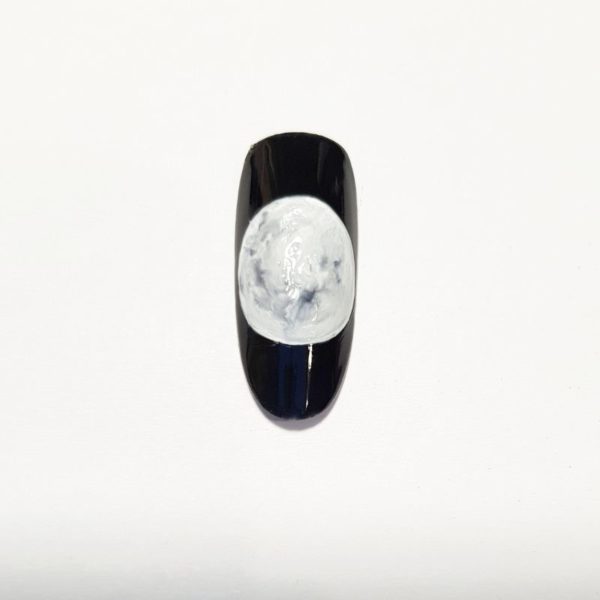 Apply a black gel polish to the entire nail. Cure. Using a white gel paint, detail a large full moon.