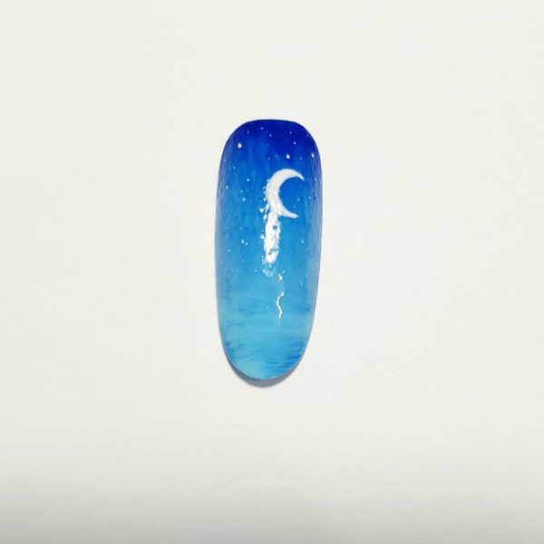 Using a white gel paint, detail a small crescent moon surrounded by stars. Cure.
