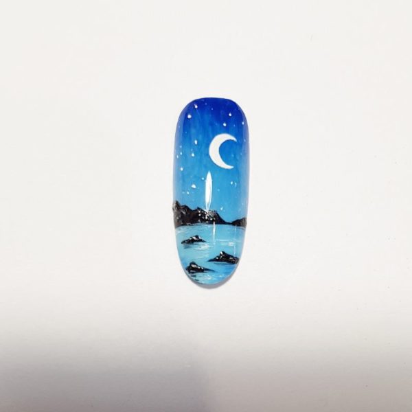 With a black gel polish, paint a mountain range and smaller stones in the water.