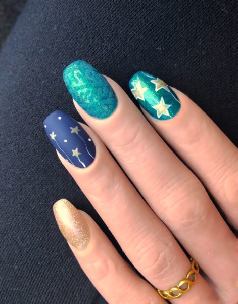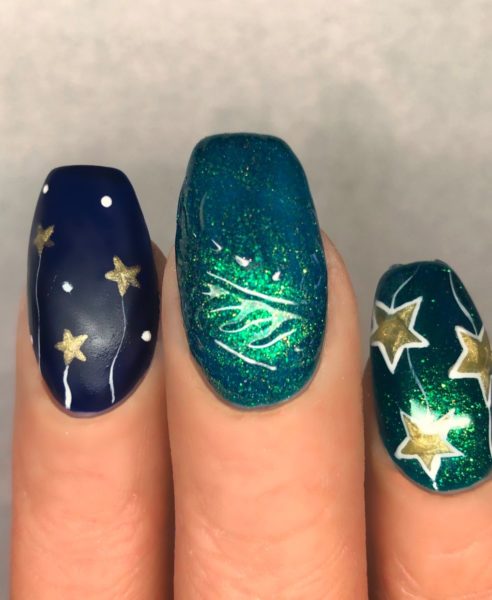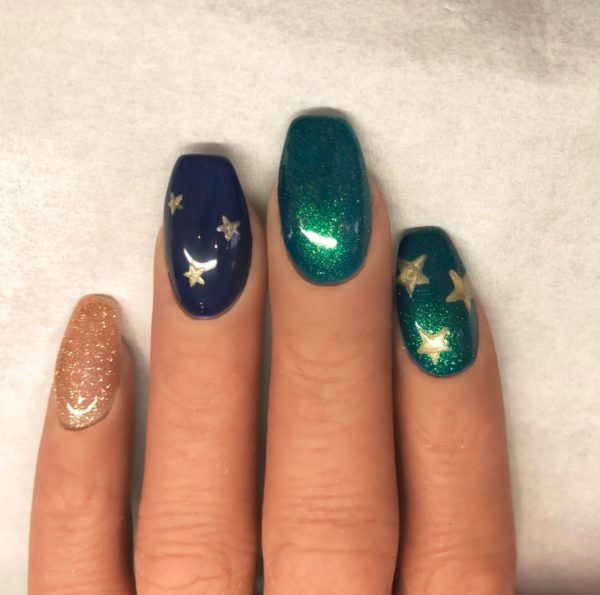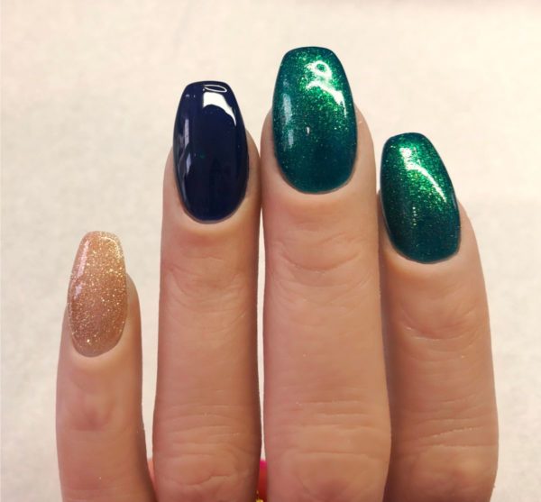 Apply Gellux Gold Rush Gel Polish to the little finger, Gellux Inky Blue Gel Polish to the ring finger and Gellux Emerald City Gel Polish to the middle and index fingers. Cure and then repeat.