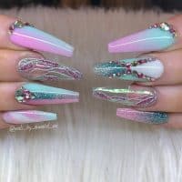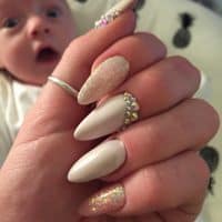 We want to see what you’re wearing on your nails! Catriona Leith, of The Nail Studio, created these nails featuring a combination of a matte white hue doused in gems…