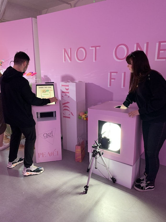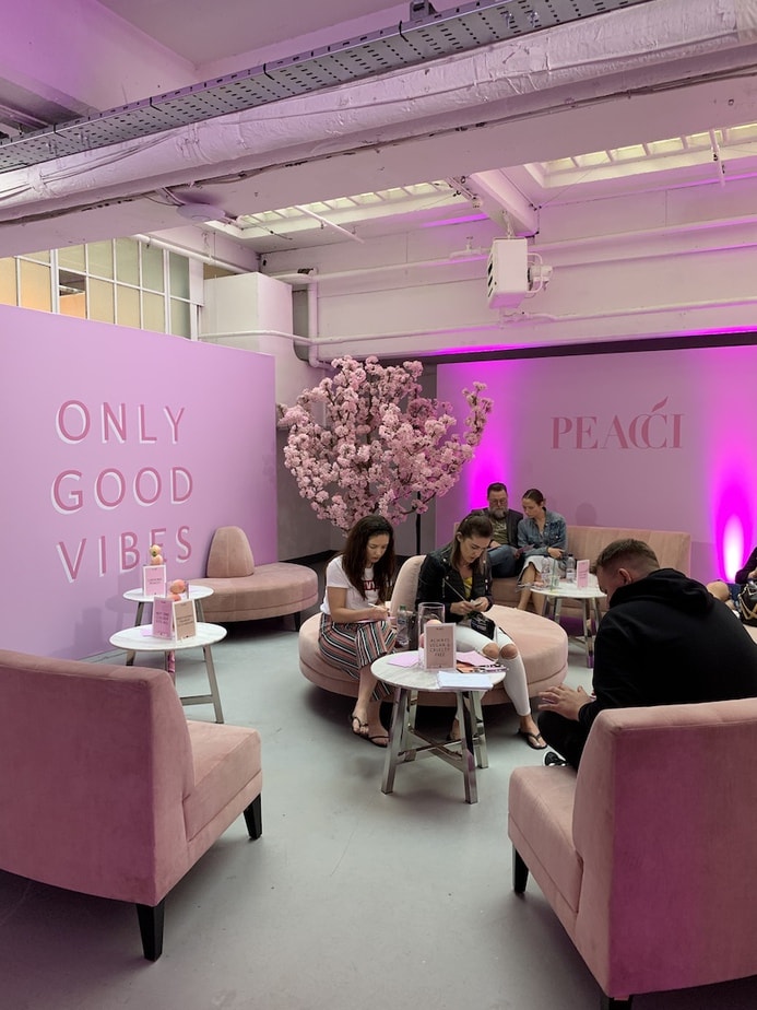 Peacći apparel was showcased on clothing rails, seeing a range of pieces for guests to choose from including hoodies and t-shirts. A ‘chill zone’ lined with plush velvet furniture in baby pink and a cherry blossom tree provided the perfect spot for guests to relax and mingle, emphasising the strong sense of community that flowed throughout the event. Opposite, Peacći nail polishes and The Gel Bottle gel polishes lined the walls next to the Peacći ‘selfie-supermarket’ where attendees snapped away to get that all-important selfie. Upon making it to the end of the venue, a pick-up point allowed techs to collect orders of Peacći apparel.