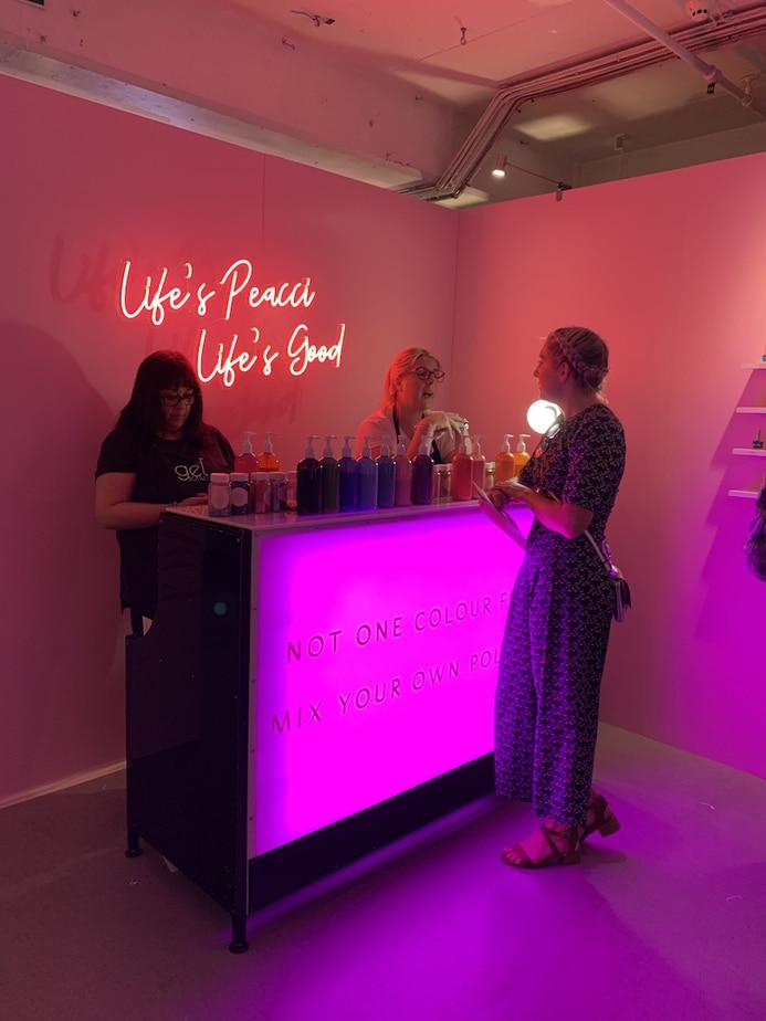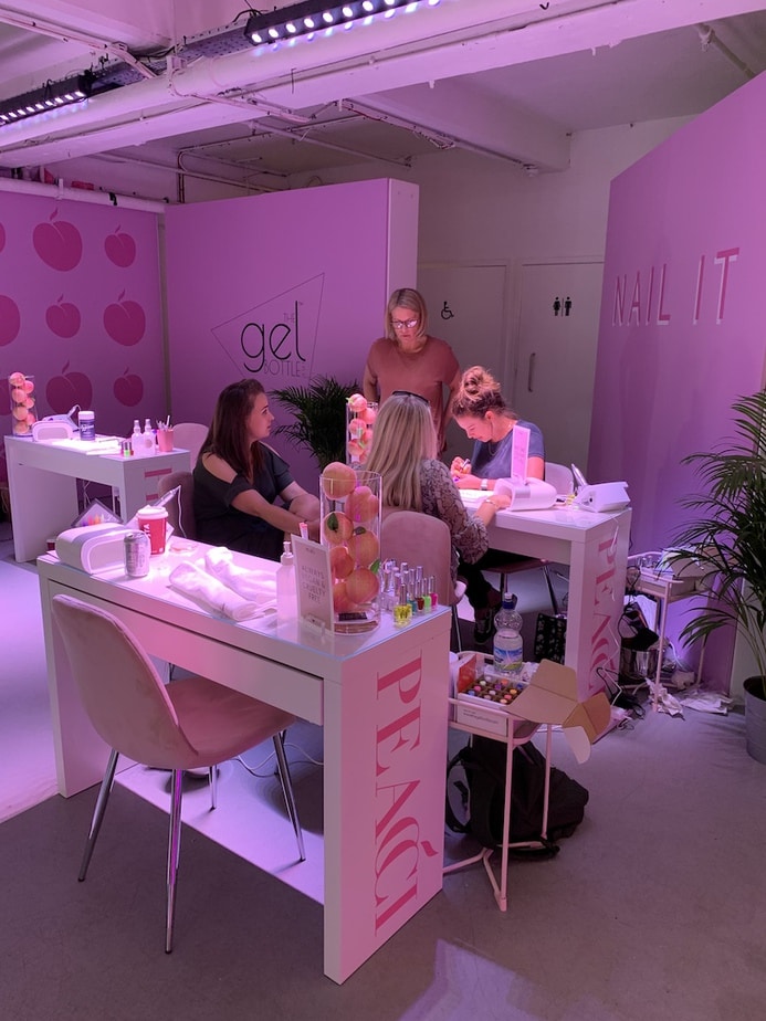 Upon arrival at the cool, urban venue, guests were greeted with a Peacći ‘check list’, map of the event, shopping list and redeemable voucher for a complimentary Peacći nail polish. Before even stepping into the event it was unmistakably The Gel Bottle; with baby pink walls, pink tunnel lighting and chic, Instagram-able interior. Walking into the space you are immediately met with a fabulous nailfie booth for guests to snap picture perfect nailfies, alongside a display of The Gel Bottle’s summer cocktail collection. To the left, four manicure desks were occupied by talented techs creating flawless nail looks for guests as the Peacći nail bar. Attendees could even mix their very own Peacći nail polish shades at the ‘mix your own’ station, boasting ‘not one colour fits all’ in luminous pink lighting.