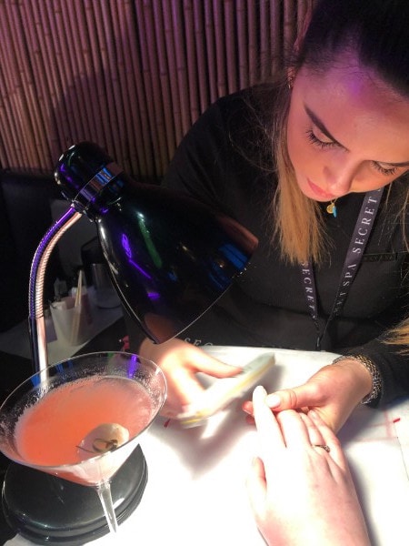 Three manicurists from Secret Spa were on hand to paint the nails of attendees with Tokyo shades, and I opted for the purpley-pink Arigato ‘From Tokyo’ hue. As my top coat was applied, I spotted a familiar face – Robbie Tomkins, session stylist and Scratch columnist. While I supped on a cocktail from a quirky lightbulb-shaped glass and we snacked on black cod, one of the delicacies being handed around by staff, he brought me up to speed on his Fashion Week antics and noted his favourite nail shades from the collection.