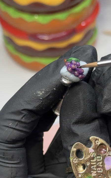 The final design, including 3D fruit, took a few days to complete, with Rosie working on small areas at a time. She used Après Gel-X Natural Round Medium Tips, with gels and art gels from Gellifique, Kokoist, Riccagel and TwentyPro, plus 3D clay from Sissi and Kkookie Zombie Top Coat.
