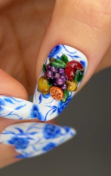 Rosie visited the space in November to glean ideas for the nail design, and reveals: “It was hard to choose what to focus on because there were so many pieces I loved. I decided on a porcelain floral base inspired by items in the ceramics galleries. However, after seeing so many still life paintings, I knew I wanted to weave their influence into the final design, so I incorporated some tiny fruits.”