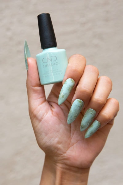One of the standout nail looks was titled Weathered Verdigris, which complemented the outfit ‘The Shard’. The green marbled effect was created using CND Shellac™ in Magical Topiary as the base, with shades Cap & Gown and Mystic Slate carefully sponged onto the nail.
