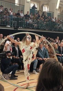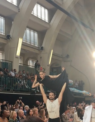 Political as ever, Vivienne Westwood themed the collection around a reinterpretation of a pack of playing cards, using each of the four symbols to convey a message. Combining male and female models, the catwalk also saw acrobats, gymnasts and dancers, accompanied by live music with politically charged lyrics. The designer herself made an appearance on the shoulders of one of the models.