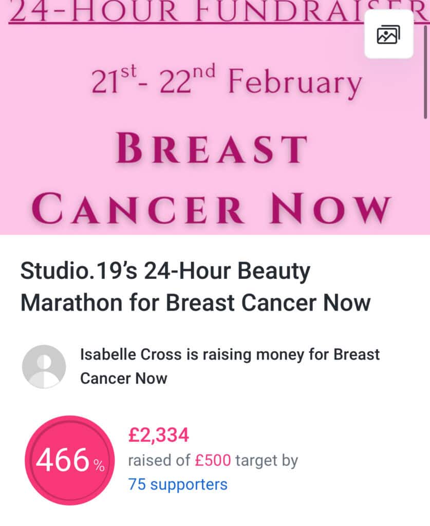 Ixworth beauty professional, Isabelle Cross, completed 24 hours of back-to-back beauty appointments to raise money for Breast Cancer Now – a charity dedicated to life-changing research and care.