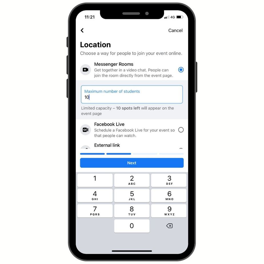 The class can be linked to a Facebook Live or an external video conferencing service via an external link. It can also be hosted via a Messenger Room, which has the option to set a maximum capacity for students attending.