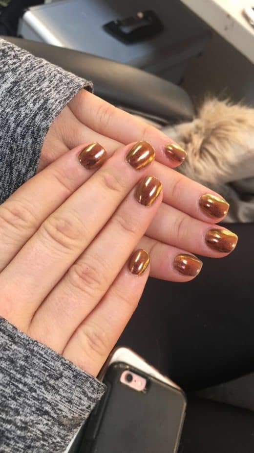 Another look I loved was for Alex who was skating with Kem! She had a deep purple jumpsuit on so I teamed this with the new GELLUX Rose Gold Chrome Flakes – she loves a bit of rose gold! These are amazing – if you haven’t already got them, you need them! I used a non-wipe topcoat underneath and they adhered beautifully to the nail.