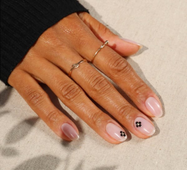 Inspired by catwalk looks featuring black lace and sequins, Midnight Blossom pairs delicate black petals with gold foil to create a striking yet minimalistic mani.