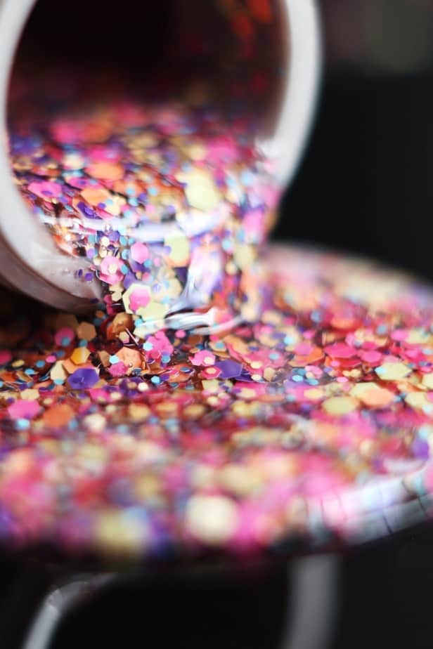 A variety of pink, violet, indigo, orange and lime hexagon-shaped fragments are engulfed in this glossy clear Kaleidoscope gel from Bio Sculpture.