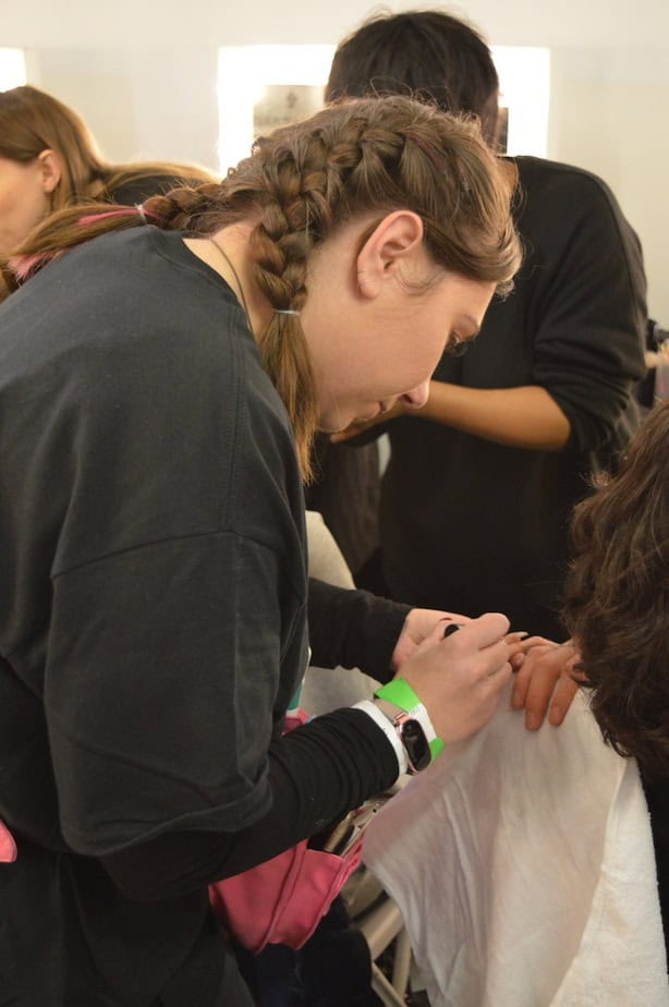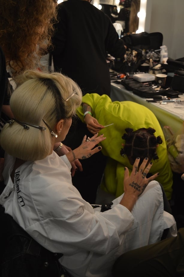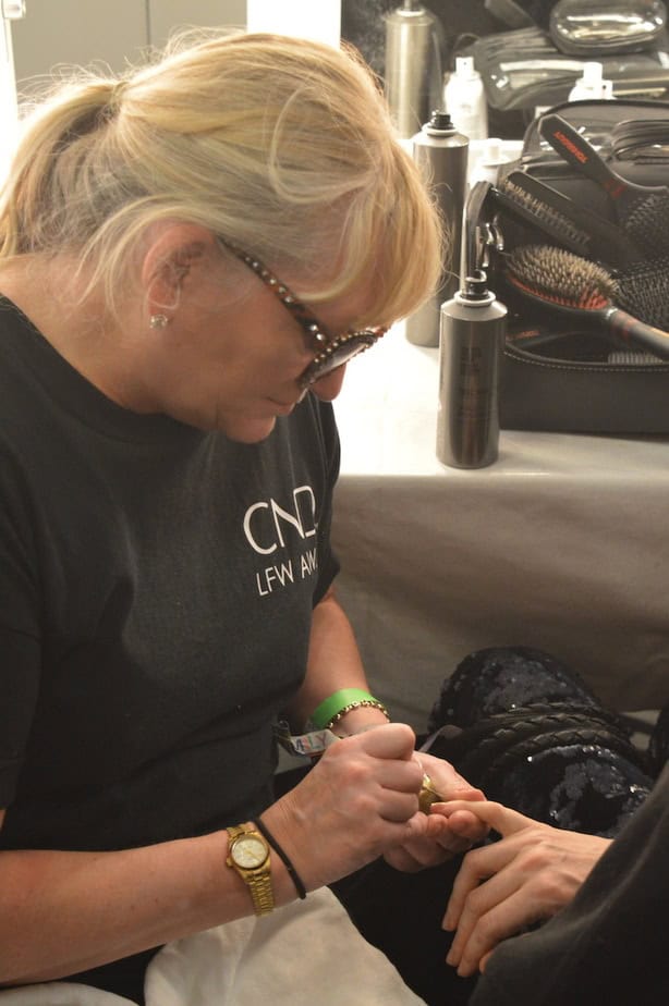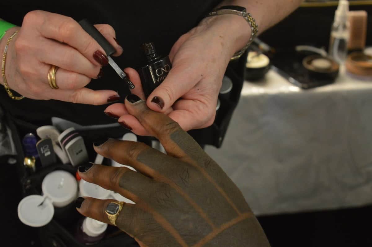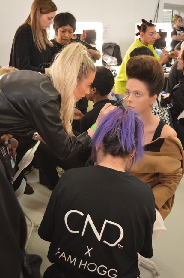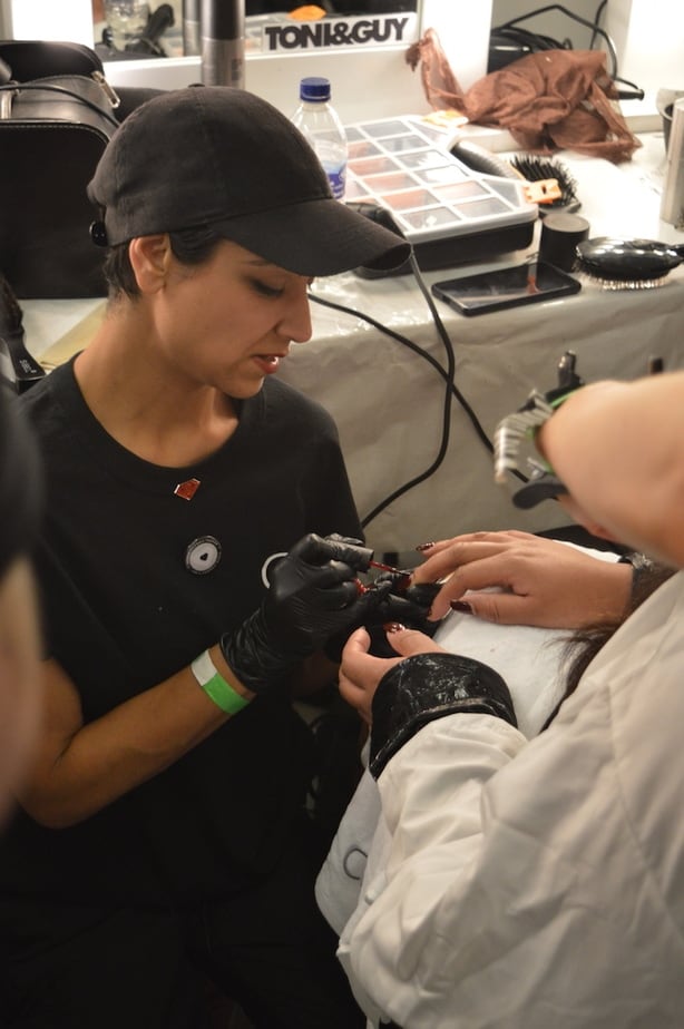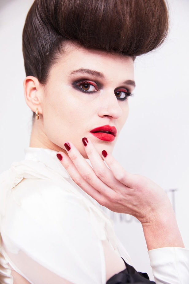 The CND nail team was led by Nickie Rhodes-Hill and included Sarah Poulten, Amy Sarah Morphey, Kay Kirsop and Bindiya Malik. With no brief, the team chose the nail look to match the prominent shades throughout the collection as well as the headpieces and masks worn by the models, opting for CND Vinylux shades in Blackpool, Oxblood and Bellini.