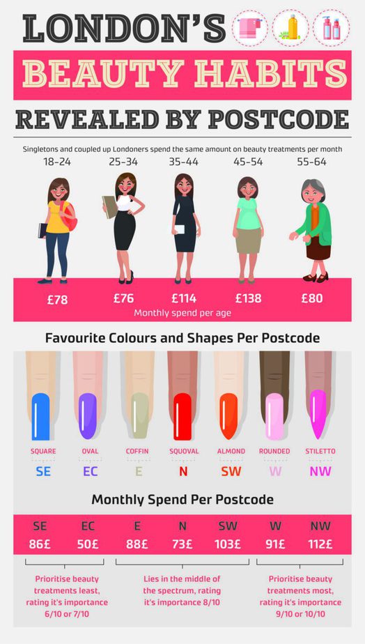 LeSalon’s research also looked at popular nail colours and shapes for each London postcode. The square shape seems to be most popular in the South, with people in East London favouring the coffin and oval shapes.