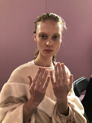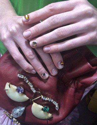 Session stylist, Michelle Class, created a bejewelled nude nail manicure for Mulberry’s London Fashion Week showcase.