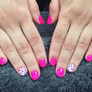 For the fourth finger, I wanted to do something a little different. Using the same application process, I created an ombre effect with pink and the blue into the nail. Using my dotting tool, I placed small dots over the colour using the top coat. Set and wipe away – what is placed under the top coat will be all that is left. It’s amazing!