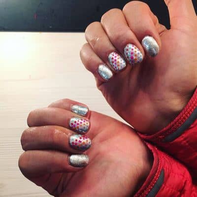 I also loved Brandee’s look this week. Unfortunately, I didn’t get the time to complete the full design but after posting her look I had fellow nail tech’s using my design as inspiration, which is so flattering! I used Salon System Gellux Gel Polish in Silver Linings. The shade is a must-have in my kit – the camera loves it! I used my doting tool and additional shades matching Brandee’s outfit to create the dot design over two accent nails on each hand.