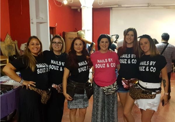 The nail team, comprising Suzanne, Em Lee, Sophie Donaldson, Lauren Lenoir, Georgia Hardwicke and Sheniene Lebond, tended to the nails of 50 models, creating over 600 nails using Gelica Gel products and various craft materials on clear stiletto tips.