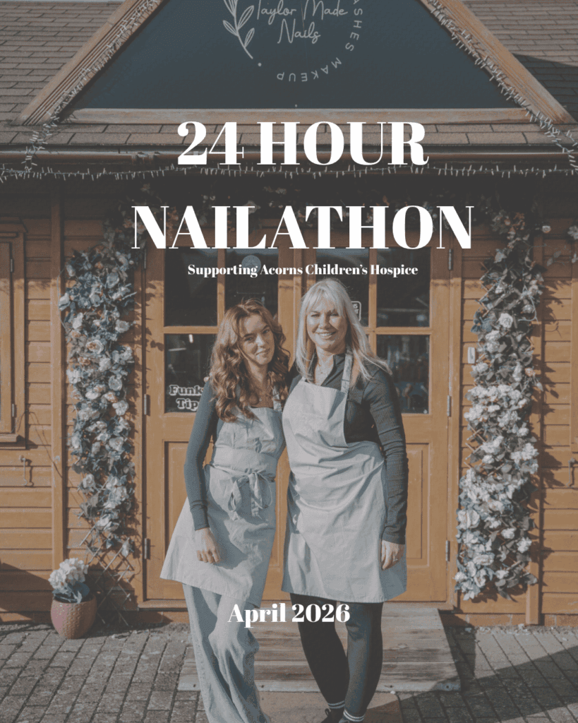 Alice has decided to take on a mighty venture in April: a 24-hour Nailathon, completing back-to-back appointments every hour. “I wanted to do something to step outside my comfort zone and support a local charity,” she comments. “I also wanted to prove that the nail industry can be part of something bigger, and use my platform to raise meaningful funds for Acorns Children’s Hospice.”