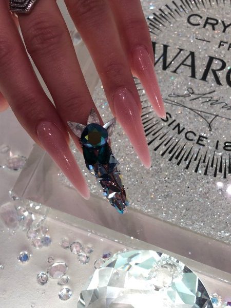 Passing grand displays of crystallised bags, jewellery and ornaments, we were seated in a board room with seven talented nail techs, each sporting long, sculpted nails. Following a presentation that briefly detailed Swarovski’s history and Austrian heritage, we were shown predictions for 2019 nail trends, including the reverse French, nail jewellery, patterns, fruit and floral nail art and embellishments.