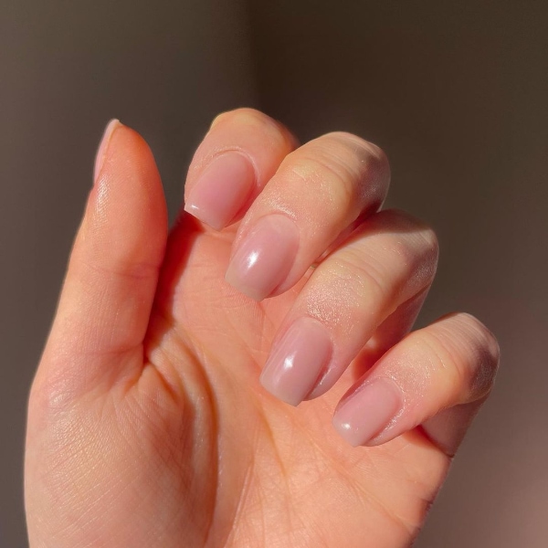 Glitterbels co-founder, Annabel Maginnis (@nails_by_annabel_m), showcases a sleek nail overlay, using Glitterbels Hema-Free Builder-Bel Gel in Barely There.