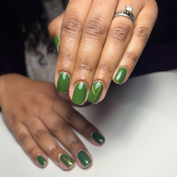 The team at Leighton Buzzard Threading & Beauty (@leightonbuzzardthreading) adds a touch of gold to a leafy green gel polish overlay.