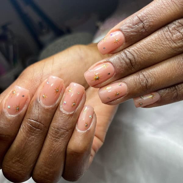 Leeds nail stylist, Matilde Andre (@matildea_nailsbeauty), adds delicate metallic details to a nude base.