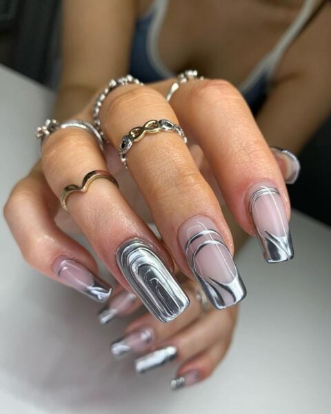 This eye-catching nail style by Vanessa Armitage of Nailicious By Vanessa (@nailicious_by_vanessa), Reddish, features silver chrome swirls and tips over a natural-looking base hue.