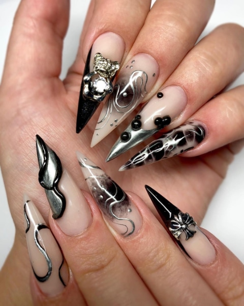 Glasgow-based nail tech, Aimee of @thelacquerlassie, showcases edgy, embellished silver and black enhancements.