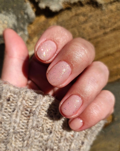 Halo VIP, Charlotte Atwill of @toc_nailsbeauty, adds Fairy Dust Glitter Non-Wipe Top Coat to a nude base.
