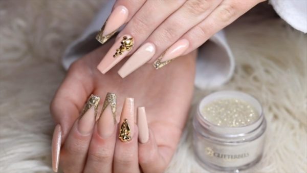 Nude nails with gold glitter using Glitterbels’ Acrylic System